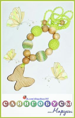Выполнен из можжевеловых бусин и хлопковых нитей. Бабочка-подвеска из бука. Предназначен для прорезывания первых зубиков у малышей.
