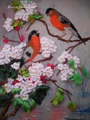 Картина на принте из лент 30*40, птицы вышиты мулине, оформлена в багетную рамку. Отправлю почтой в любой уголок мира.