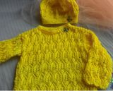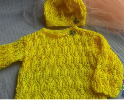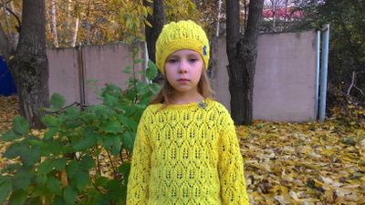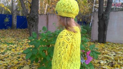 Модель выполнена из акриловой очень мягкой пряжи, воротник украшен двумя бабочками. Длина изделия 43 см, длина рукава 30 см, ширина груди под проймой 31 см. На фото девочка 5 лет, ее размер 110-116