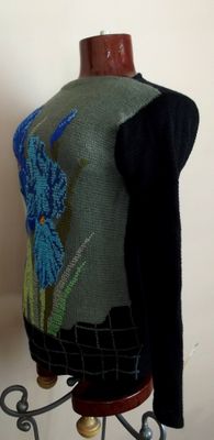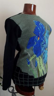 Женский пуловер выполнен в технике тунисского вязания, украшен вышивкой. Материал - тонкая полушерсть. Модель выполнена в единственном экземпляре. Длина изделия - 71см длина рукава - 57см Стирка в режиме "деликатный" или ручная, сушить в расправленном виде. Доставка по России бесплатно