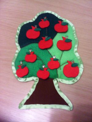 Текстильное развивающее дерево с яблоками (5 больших и 5 маленьких) направлено на развитие мелкой моторики, тактильных ощущений, изучению математических понятий ( большой-маленький, больше-меньше, выше-ниже, много-мало, один-много и т.д.),счет до 10. Яблочки вешаются на дерево на крючки.