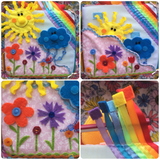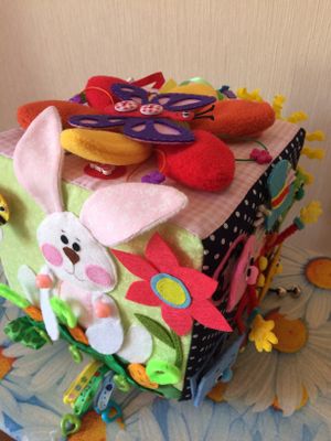 Развивающий кубик подойдёт для деток от 1,5 до 3,5 лет. Имеет съёмные детали, разные застежки, интересные сюжеты. Многие детали шуршат, сам кубик звенит. Размер куба 16 см на 16 см.