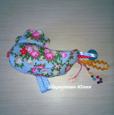 Развивающая игрушка для детей - птичка, небольшого размера 15х10 см, можно взять с собой в дорогу или просто играть дома. Сшита из 100 % хлопка, лент, деревянных бусин, наполнитель синтепух. Крылья и хохолок шуршат. Прекрасно подойдет для развития мелкой моторики и прорезывания зубок, а также в качестве игрушки-сплюшки.