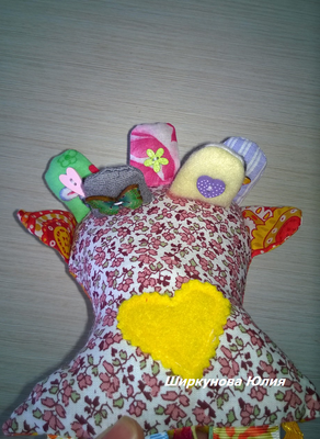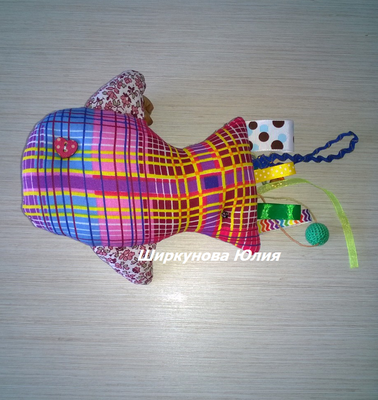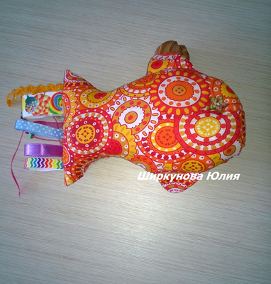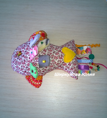 Развивающая игрушка для детей - рыбка, небольшого размера 20х15 см, можно взять с собой в дорогу или просто играть дома. Сшита из 100 % хлопка, лент, деревянных бусин, наполнитель синтепух. Чешуйки сшиты из различных материалов. В наличии две рыбки разного исполнения: 1. Чешуйки наполнены крупами и шуршащим материалом для развития мелкой моторики. 2. Чешуйки наполнены синтепухом, к каждой чешуйке пришиты пуговицы и деревянные бусины, позволяют изучать предметы (все пуговки разные) и цвета (бусины разных цветов), плавники шуршат. Рыбки двухцветные, в фотографиях указаны также оборотные стороны игрушек. Прекрасно подойдет для развития мелкой моторики и прорезывания зубок, изучения предметов и цветов, а также в качестве игрушки-сплюшки. Под заказ 3-5 дней.