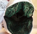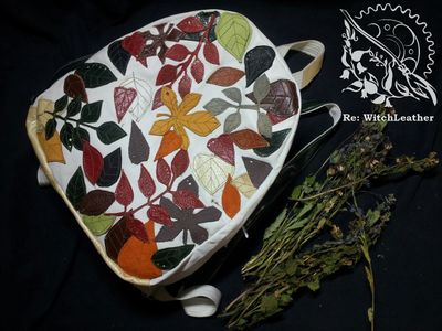 Выполнен из натуральной белой кожи, толщина 1,2-1,4 мм, российского производства. Кожа-компаньон (дно) золотисто-жемчужная, 1,4-1,6 мм Лямки регулируемые до 90 см, , усилены стропой. Габариты 28*25*11 Украшения: аппликация в виде цветных листьев. Подкладка из прочной ткани изумрудного цвета с растительным узором. Одно основное отделение на молнии, имеется внутренний накладной карман. На задней стенке дополнительный вместительный карман на молнии.