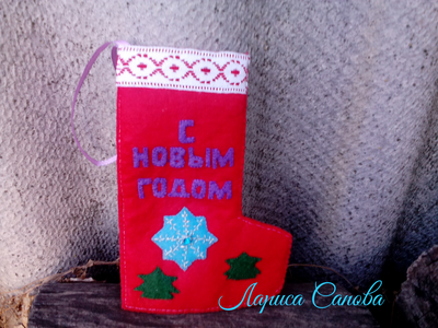 В работе использовано фетр , кружево , атласная лента , нитки мулине , стразы пришивные , нитки с люрексом . Длина сапожка 18 см. ширина 11см.