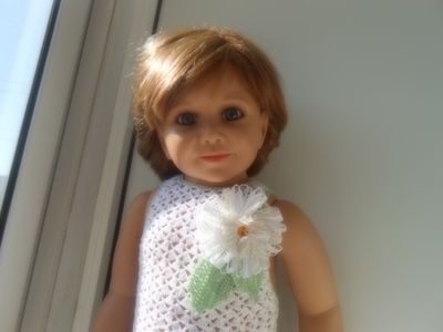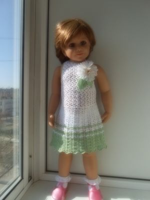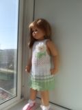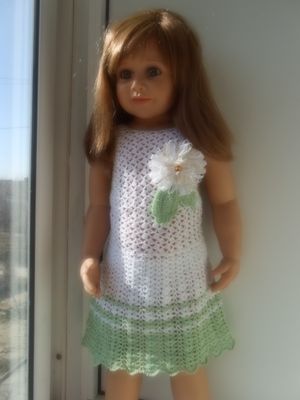 Летний сарафан связан крючком из тонкого мерсеризованного хлопка для девочки 2-4 лет.Сарафан-трапеция, застегивается на бретельки,что позволяет регулировать длину изделия.Украшен букетиком цветов изготовленном на луме.