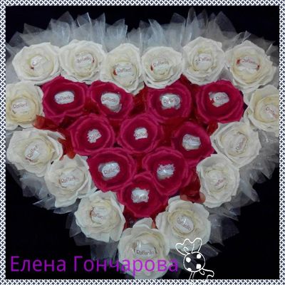 Сердце из 25 роз с конфетами рафаэлло.