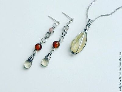 Серебряные серьги с агатом и раух-топазом, кулон серебряный с кварцем "волосатиком". Серебро 925. Без цепочки.