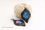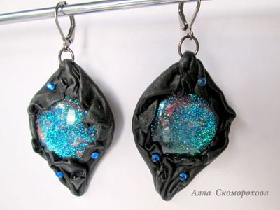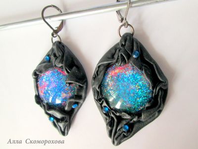 Таинственные глубины галактики Андромеда заключены в кабошон из ювелирной смолы, обрамлены в натуральную кожу и дополнены стразами Сваровски. Трудно передать на фото всю игру и глубину цветов - от голубого сияния до сапфировых и пурпурных оттенков. Французский замок цвета воронёной стали. Размер серёг 3,5х5 см (без фурнитуры). Длина изделия вместе со швензой 7 см.