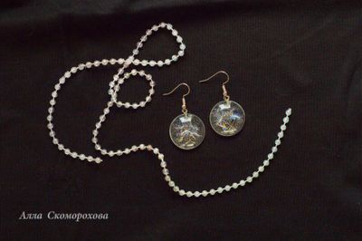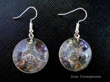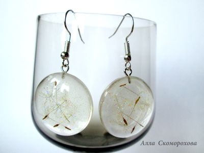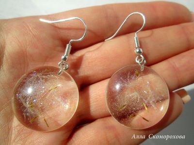 Серьги из прозрачной ювелирной смолы с пушинками одуванчика. Внутри переливаются голубоватые блёстки, поэтому кажется, будто пушинки заморозили в маленьких льдинках. Серьги очень лёгкие, диаметр 25 мм.