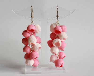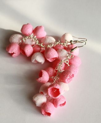 Длинные сережки с шапочками-колокольчиками из полимерной глины. Длина вместе со швензой 8 см. Шапочки выполнены с применением соляной техники. Несмотря на длину, сережки легкие и по летнему нежные. Фурнитура под серебро.