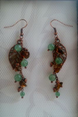 Серьги из фурнитуры под медь, бусин нежно-зеленого нефрита и крошки солнечного янтаря, длиной 7см