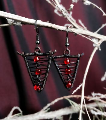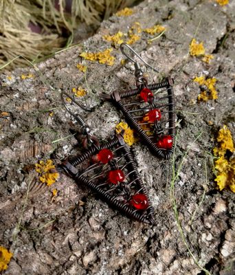 Темные геометрические серьги с яркими красными бусинами, которые напоминают капли крови на доспехе бывалого воина Возможно изготовление аналогичного кулона, получится очень лаконичный, но привлекающий внимание комплект. Медь состарена и покрыта лаком