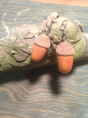 Серьги "Желуди". Верхняя часть -шляпка настоящего желудя, пропитана маслом. Нижняя часть - красное дерево. Покрыта акриловым глянцевым лаком.