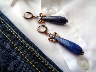 Очаровательные серьги из лазурита и голубых цирконов на медной фурнитуре. Серия "tweed & denim" Длина серёжек 6 см