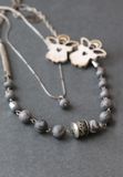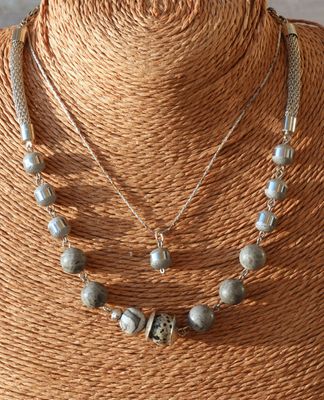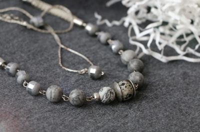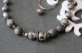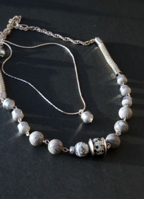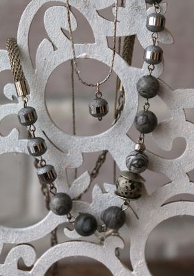 Монохромный чокер собран из различного мрамора серых оттенков и металлических элементов. Слегка асимметричный и немного брутальный, тем не менее он впишется и в классический образ, и в наряд в стиле гранж, подойдет и к небольшому платью. Нежный подвес прекрасно дополняет это скромное украшение. Маленькая серая стеклянная бусина с зеркальным кантом (такая же как по краям колье) подвешена на старую посеребренную, но потертую и местами потемневшую цепочку. Украшение получилось достаточно нарядным, весьма бюджетным и многовариантным. Название – уменьшительное от «Корделия». Длина чокера 38-52 см., длина цепочки 40-45 см., подвес 1,5 см. Материалы: мрамор, стеклянные бусины. металлофурнитура.