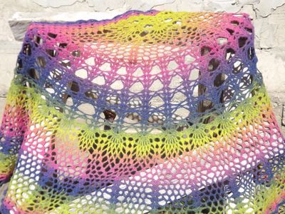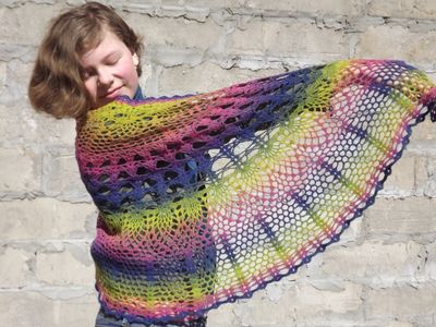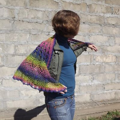 Шаль из прибалтийской пряжи секционного крашения, связана крючком. Вес - около 115 граммов. Теплая и легкая, по-весеннему яркая и ажурная.