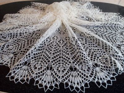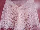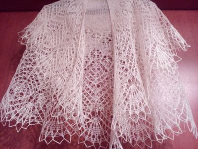 Белая ажурная шаль серповидной формы изготовлена из шерсти мериноса, слегка украшена бисером,хорошо драпируется, хороша как под верхнюю одежду вместо толстого неудобного шарфа, так и поверх шубки, пальто или курточки!