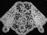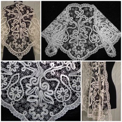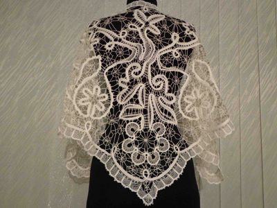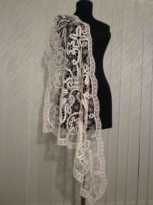сплетена на коклюшках в технике "Елецкое кружево" . Рисунок в виде цветочного орнамента,по краю косынки фестоны.Изделие плетётся ,по желанию заказчика,из хлопка(12000 руб.) или шёлка натурального (14000 руб-Невесомо лёгкий и пластичный.)Цвет шёлковой шали в ассортименте: тёмное золото,рыжее золото,цвет шампанского