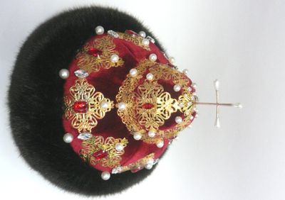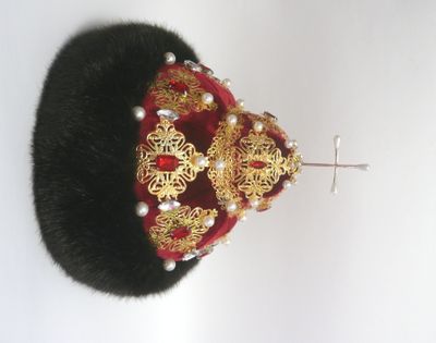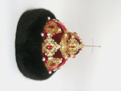 Оригинальный деловой подарок «Шапка Мономаха», изображающий старейший символ самодержавия в России, станет прекрасным сувениром для государственного деятеля, для бизнесменов и своих любимых мужчин. Такой сувенир — это выражение глубочайшего уважения и, одновременно с этим, пожелание добиться всех возможных высот. Безусловно, этот подарок для мужчины станет одним из самых приятных знаков внимания. Этот сувенир украсит любой интерьер, предаст блеск и неповторимость вашему дому или рабочему кабинету. Текстильная шапка ручной работы, выполнена в единственном экземпляре. Легкая, отлично держит форму, выполнена из итальянского бархата бордового цвета, на стеганном подкладе. Отделана филигранью и различными бусинами- перл, горный хрусталь, стекло, самоцветы, стразы. Опушка выполнена из экомеха под норку темно-коричневого цвета. Экомех - это современный материал, который внешнее практически не отличается от натурального. Ворсинки искусственного меха более однородны и равномерны, и главное, при производстве изделия из этого материала не пострадало ни одно животное. Комплектность: 1.Шапка 2. Подарочная коробка круглая 3. Специальная подставка под шапку