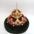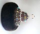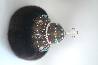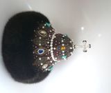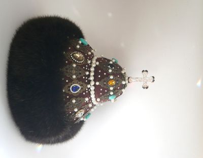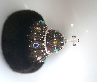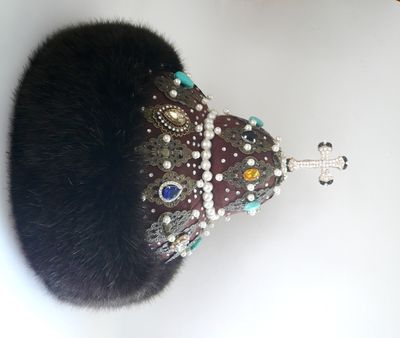 "Шапка Мономаха" -главная регалия русских великих князей и царей. Символ власти и самодержавия. Прекрасный подарок для начальства и любимых мужчин. Украсит любой интерьер, предаст блеск и неповторимость вашему дому. Текстильная шапка ручной работы, выполнена в единственном экземпляре. Легкая, отлично держит форму, на стеганном подкладе. Отделана филигранью под старинную бронзу и различными бусинами- бирюза, жемчуг, перл, горный хрусталь, стекло. Опушка из экомеха под норку. Экомех это современный материал, который внешнее практически не отличается от натурального. Ворсинки искусственного меха более однородны и равномерны, и главное, при производстве изделия из этого материала не пострадало ни одно животное.