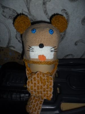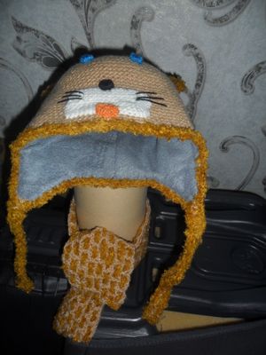 Детская шапочка с шарфом связана крючком. Пряжа не колется шерсть с акрилом ,обвязана травкой. Подкладка из флиса. Размер 42-44.