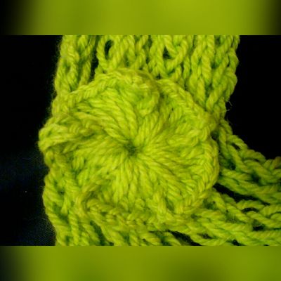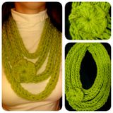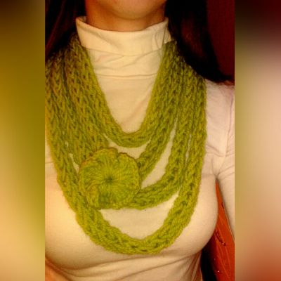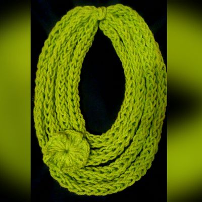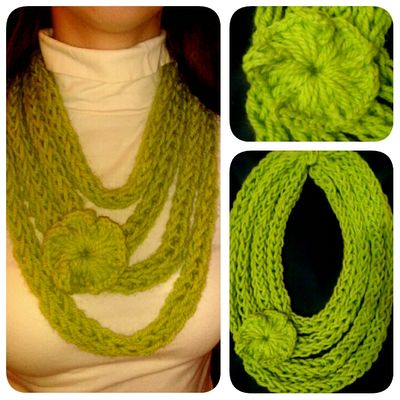 Шарф-колье, связан на пальцах, без использования спиц и крючка. Пряжа шерсть/акрил (75%/25%), салатового цвета. Общая длина жгута 3 метра, сложен в 4 оборота. Украшен легким цветком, связанным крючком (цветок пришит). Идеально на весну-осень. Будет красивым дополнением вашего образа, и в то же время согреет за счет содержания шерсти составе). Можно носить как на верхнюю одежду - как шарф-снуд, так и в качестве альтернативы традиционным бусам и колье. Длина 30 см (длина по вертикали) Свяжу в любом цвете и любого размера, по Вашему желанию. Срок выполнения 1 день.