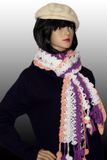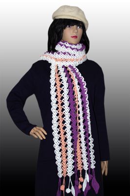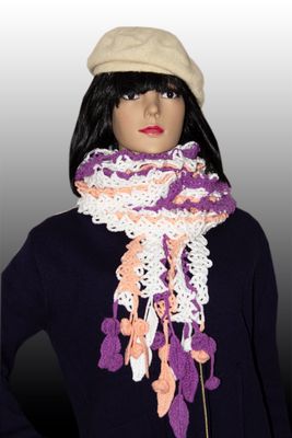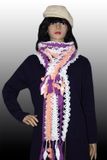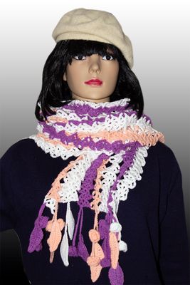 Шарф выполнен крючком из ленточного кружева. Края шарфа украшены вязаными листиками и цветками. Длина шарфа 186 см, ширина 36 см. длина листиков и цветков 11-18 см. Цвета: белый, кремовый, светло-черничный. Шарф теплый, пряжа приятная на ощупь, мягкая не колется. Удачных вам покупок!