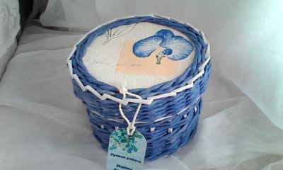 плетеная шкатулка - изготовлена из бумажной лозы, окрашенной колером, покрыта акриловым лаком. Легкая и прочная. Оригинальный подарок. Размер : диаметр 16 см, высота 12 см.