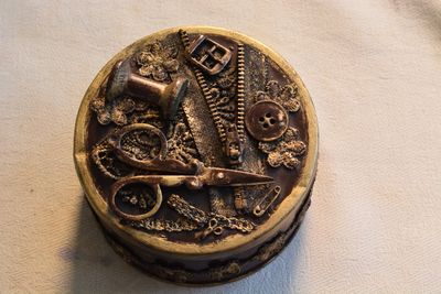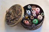 Металлическая шкатулка для ниток с золотой патиной.
