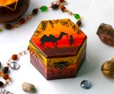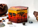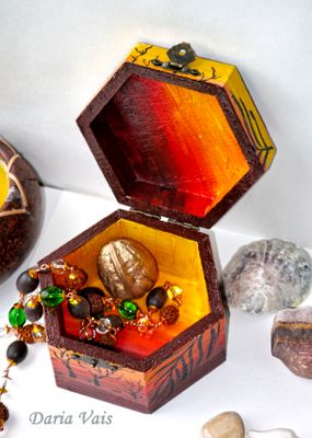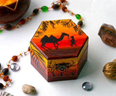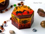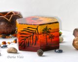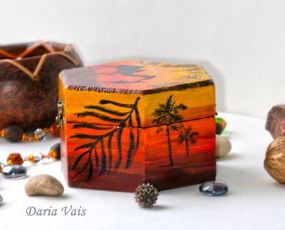 У меня есть серия работ посвященная пустыни: комодик, браслет, шкатулка. Выполнено с огромной любовью и вдохновением после поездки в Иорданию. Заряжено счастьем и любовью))) Функциональный по любому случаю.:) Выполняю роспись стен, роспись дерева (можно мебели) - работы под заказ по Вашим эскизам и моим. Обращайтесь))) Материалы: дерево, акриловые краски, лак Размер: ширина в самом широком месте 10 см, высота 6,5 см