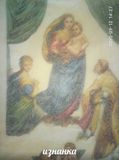 Репродукция картины Рафаэля Санти «Сикстинская Мадонна» (итал. Madonna Sistina) выполнена в технике "счетный крест" Картина холстом, без багета (для удобства транспортировки и сохранения возможности покупателя выбрать багет, подходящий по стилю к его интерьера))) Размер 76 х 112 Канва Аида 16 (лен) Сама картина Рафаэля, с 1754 года находится в Галерее старых мастеров в Дрездене. Принадлежит к числу общепризнанных вершин Высокого Возрождения.