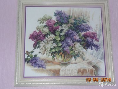 Картина вышита крестом, оформлена в раму с двойным паспарту, под стекло, с креплением. Очень красивая вышивка.