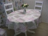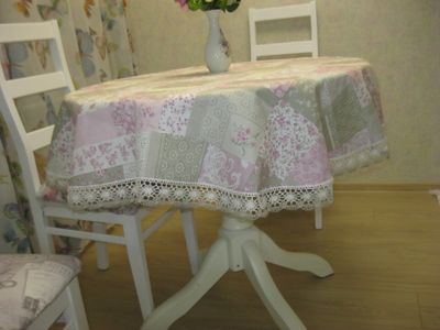 Скатерть на обеденный стол в форме овала изготовлена из ткани со специальной пропиткой, препятствующей появлению пятен, украшена кружевом из 100% хлопка. Размер 140х100 см. Возможно изготовление по вашим размерам.