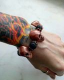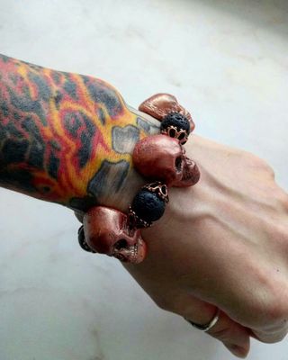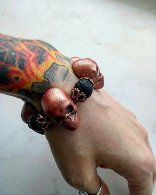 Браслет с черепами(полимерная глина Fimo)и камнями(лава),медной фурнитурой , и сами черепа с медным отливом,легкий. На силиконовой резинке. Ручная работа.