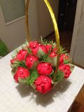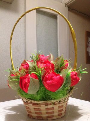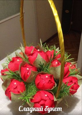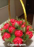 Ручной букет из конфет - оригинальная альтернатива обычным букетам. А шоколадные конфетки внутри подарят тепло за чашечкой чая. Состоит из 15 цветов, внутри которых спрятаны конфетки Рафаэло, Nue. Композиция дополнена искусственными цветами, лентами и элементами декора. Букет передается в прозрачной упаковке с лентами. Работа может быть выполнена в любой цветовой гамме.