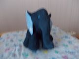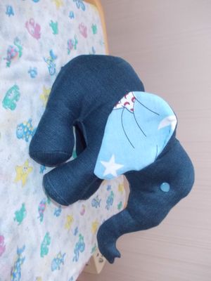 Слоненок выполнен из джинсовой ткани и в качестве ткани компаньона взята плотная бязь. Набит плотно синтепоном. Место набивания синтепоном зашито в ручную и снаружи укреплено вручную нитками мулине. Так же возможно исполнение по данной выкройке такого слоненка из любой другой ткани на заказ.