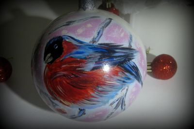 Стеклянный елочный шар с ручной росписью акриловой краской. Диаметр - 10 см. Финишное покрытие - акриловый лак.