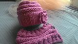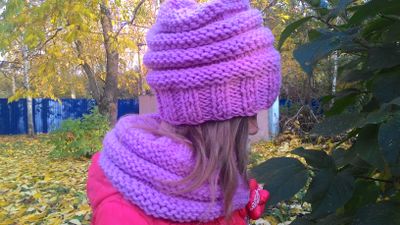 Модель выполнена спицами из полушерстяной пряжи. Украшение - две деревянные пуговицы, вышитые ниткой из пряжи основного цвета снуда. На фото модели 5 лет