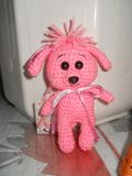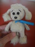 собачка Соня связана крючком из акрила, возможно добавление ниток травки, рост - 10-12 см, статична, не стоит, не сидит, может служить подвеской в авто или брелком, наполнитель - синтепон