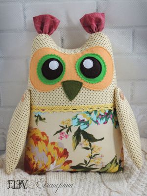 Игрушка Сова сшита из хлопка и сатина, глазки и клюв из фетра. Крылья на пуговичном креплении. Может служить и игрушкой, и подушкой, и декором в комнате. 20 Х 27 см
