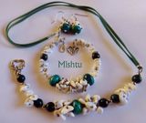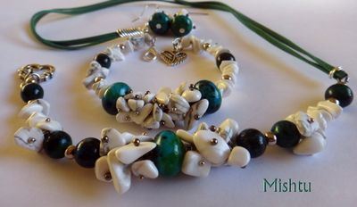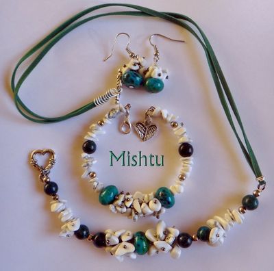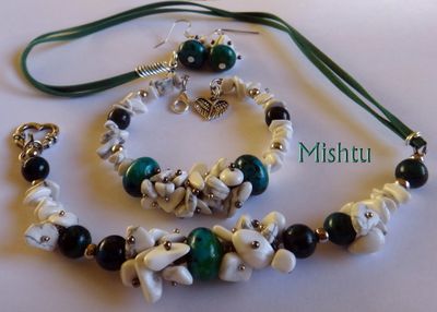 Комплект из хризоколлы и кахолонга. Колье под ворот рубашки, небольшие серьги и браслет на жесткой основе.