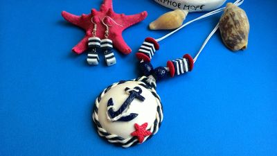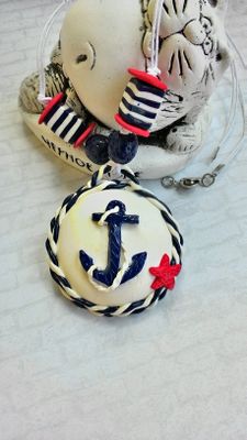 Кулон и серьги сделаны из запекаемой полимерной глины.Кулон очень легкий собран на вощенный шнур длина 64см, размер кулона 5,5 см . Серьги маленькие и легкие.