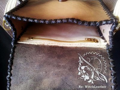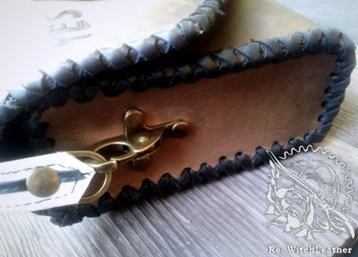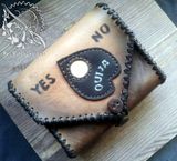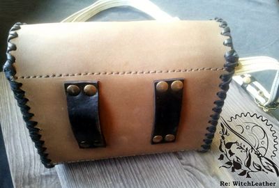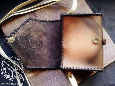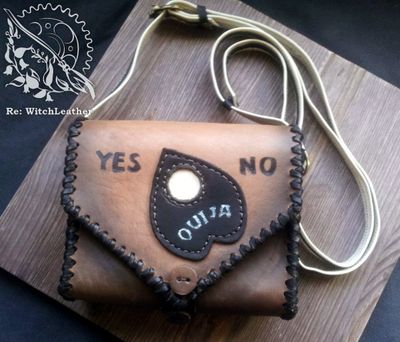 Выполнена из натуральной кожи, толщина 2,2-2,4 мм российского производства. Вешается на ремень, шириной до 5 см, также можно носить через плечо. Лямка съемная, на очень удобных карабинах. Когда ее снимаете карабины остаются на сумке, на ремешке только металлические колечки. (мне кажется неудобным, когда съемные ремни имеют большой вес и объем из за карабинов). Декоративная пряжка позволяет регулировать длину лямки от 85 см (когда сумка находится на уровне локтя и талии) до 148 (сумка располагается под ладонью вытянутой руки), конец ремешка фиксируется, чтобы не болтался, Декоративная пряжка для регулировки. Габариты 13*16*5,5 Украшения: аппликация в виде планшетки уиджи, тонировано аэрографом, пирография. Одно основное отделение, замок- магнит, пуговица для дополнительной фиксации. Есть внутренний карман на молнии. Все швы выполнены вручную, седельным швом.