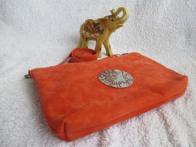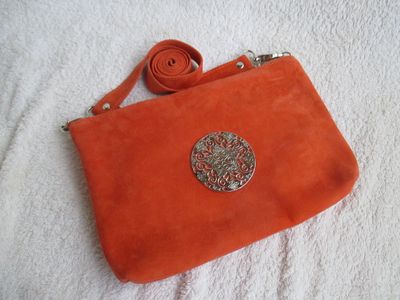 Авторская кожаная сумочка ручной работы "Огненный Феникс" из натуральной замши-велюр. Выполненная из натурального мягкого и приятного на ощупь велюра, эта сумочка на длинном ремешке станет для Вас лучшей спутницей. Яркая сумочка огненного цвета обладает удобными размерами, что позволит поместить в нее много необходимых предметов. Передняя сторона сумочки декорирована пряжкой с цветочным узором Подклад - "звездный" шелк. Донышко сумочки 3 см. Внутри есть карман на молнии и карабин для ключей на ремешке. Фурнитура итальянская, под серебро. Размеры: 26 х 18 см Доставка почтой России: 200 руб. Товар обмену и возврату не подлежит.