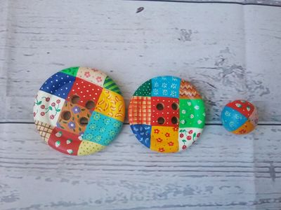 Пуговицы и шарик с росписью под пэчворк. Диаметр 8 см, 7 см и 3 см. Можно повесить на стену, приклеить к комоду, или к шкатулке.