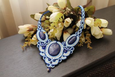 лазурит, чешское стекло, европейский сутаж, японский бисер, изнанка прошита...