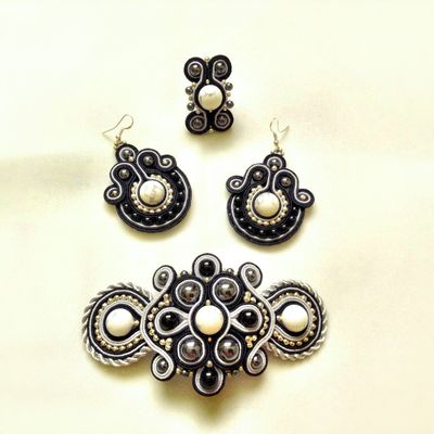 Сутажный комплект: серьги, кольцо и заколка. Изготовлены с Белорусского плотного сутажам использованием камней.