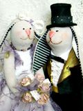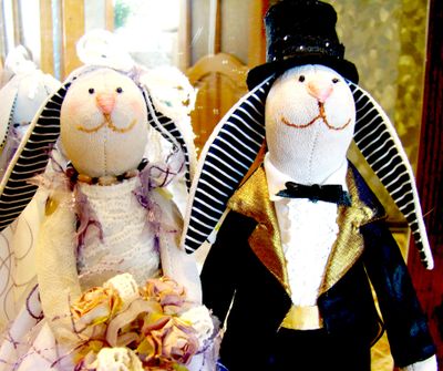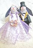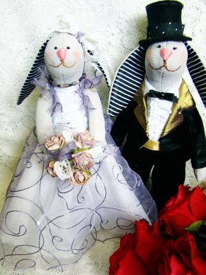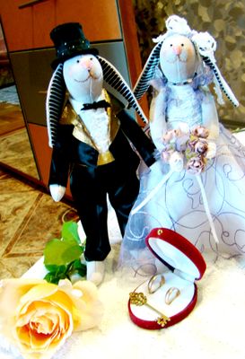 Текстильные свадебные зайцы-тильды. Незабываемый и необычный подарок на торжество бракосочетания или на юбилей. Эксклюзивный подарок, который будет радовать супружескую пару долгие годы. Самостоятельно стоят. Крепление ручек - пуговичное. Мордочки вышиты нитками мулине, глазки - чешский бисер. В лапках свадебный букет. Высота 26-28 см.